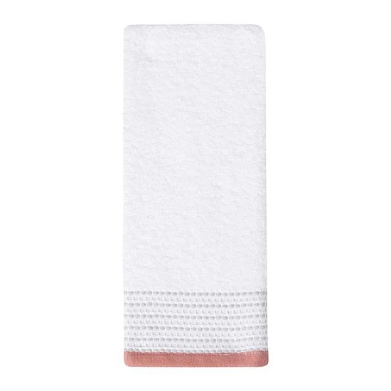 - This beautiful hand towel is the perfect addition to any bathroom or kitchen decor. It features a dobby fabric with gray details and red edge trimming.